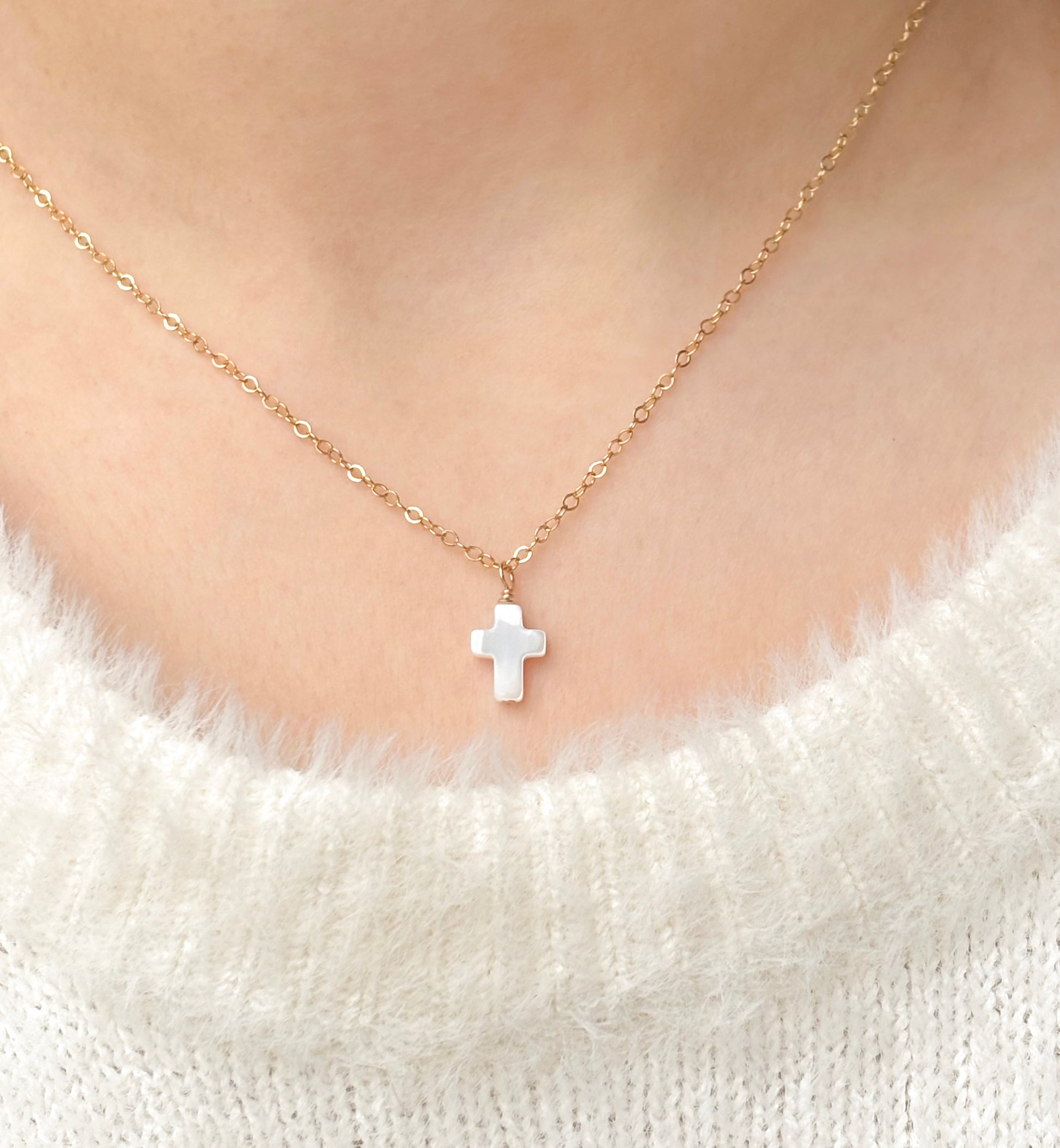 This Pearl Cross Necklace is a delicate piece, featuring a classic chain and a little mother of pearl cross. Minimal, chic, and effortless—perfect for everyday wear.