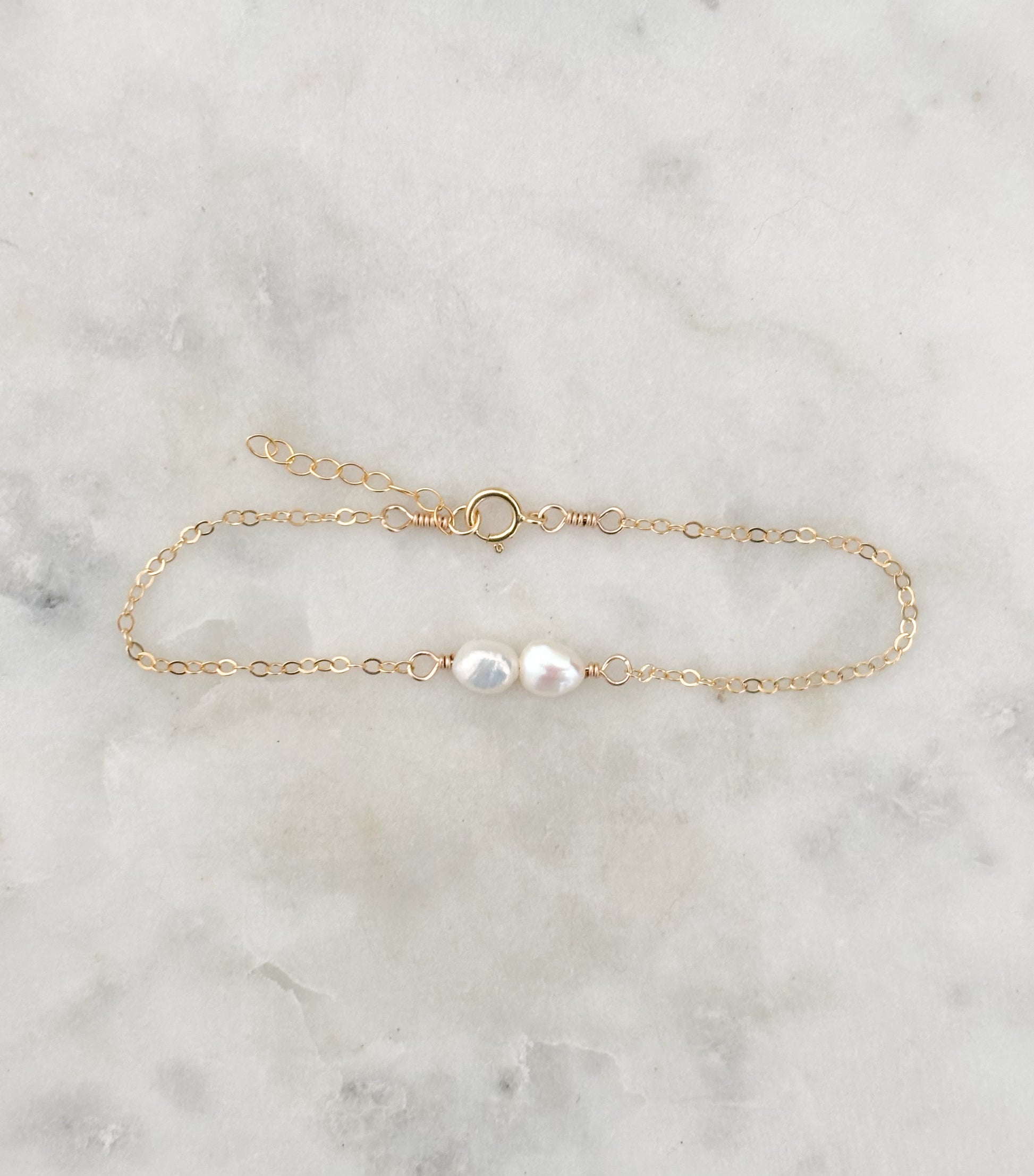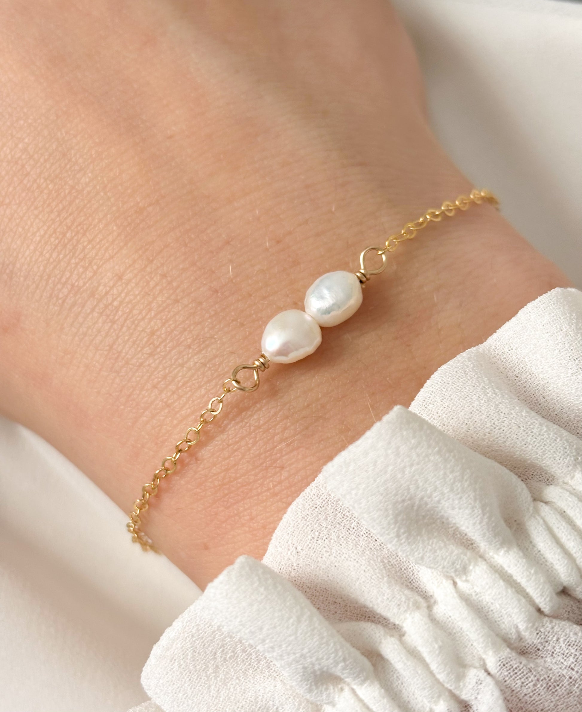 The Brielle Bracelet is a delicate piece, featuring two lustrous freshwater pearls though a classic chain. Minimal, chic, and effortlessly timeless—perfect for everyday wear or layering.