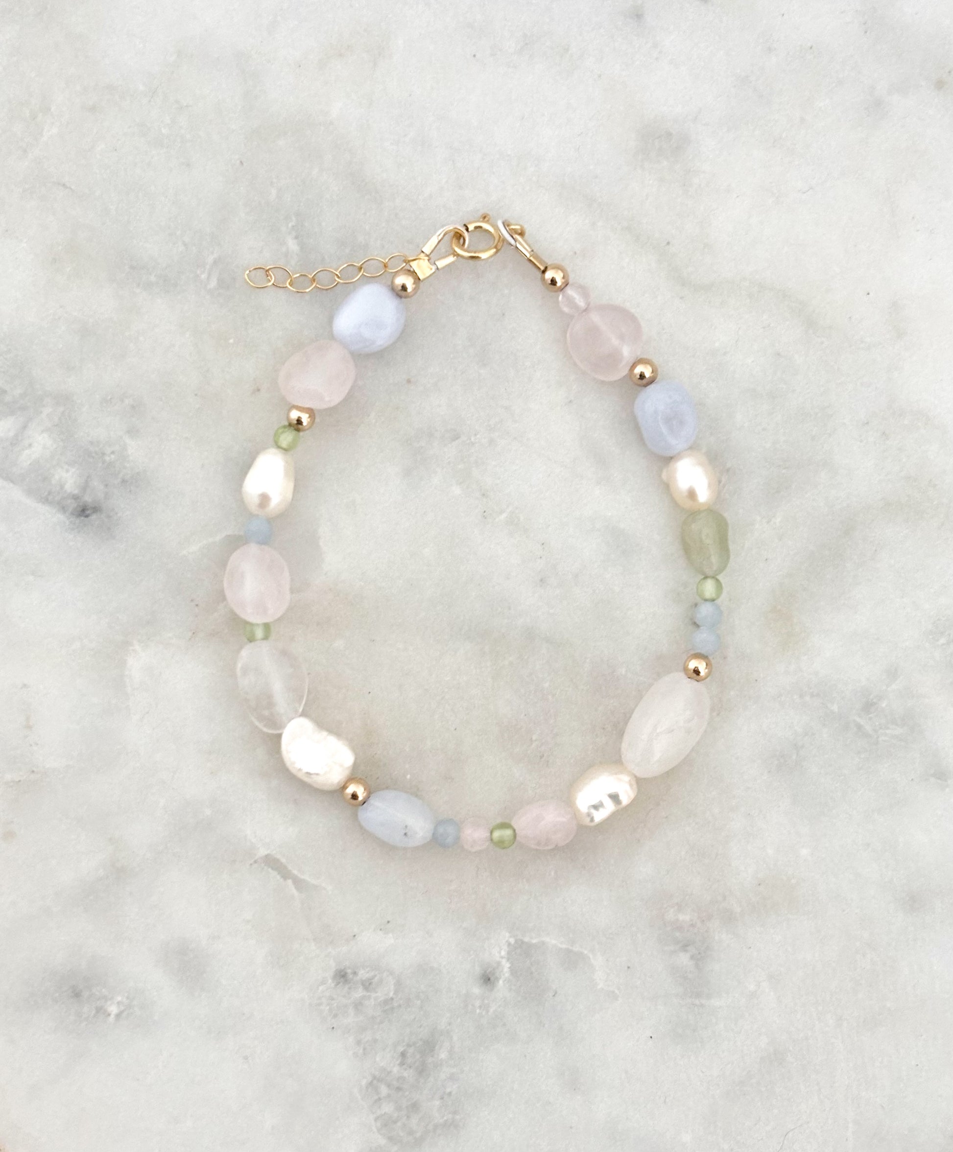 The Palongside Bracelet features delicate freshwater pearls and a mix of morganite, rose quartz, peridot, blue lace agate, and angelite. Handcrafted to bring a touch of colour and charm to your day.